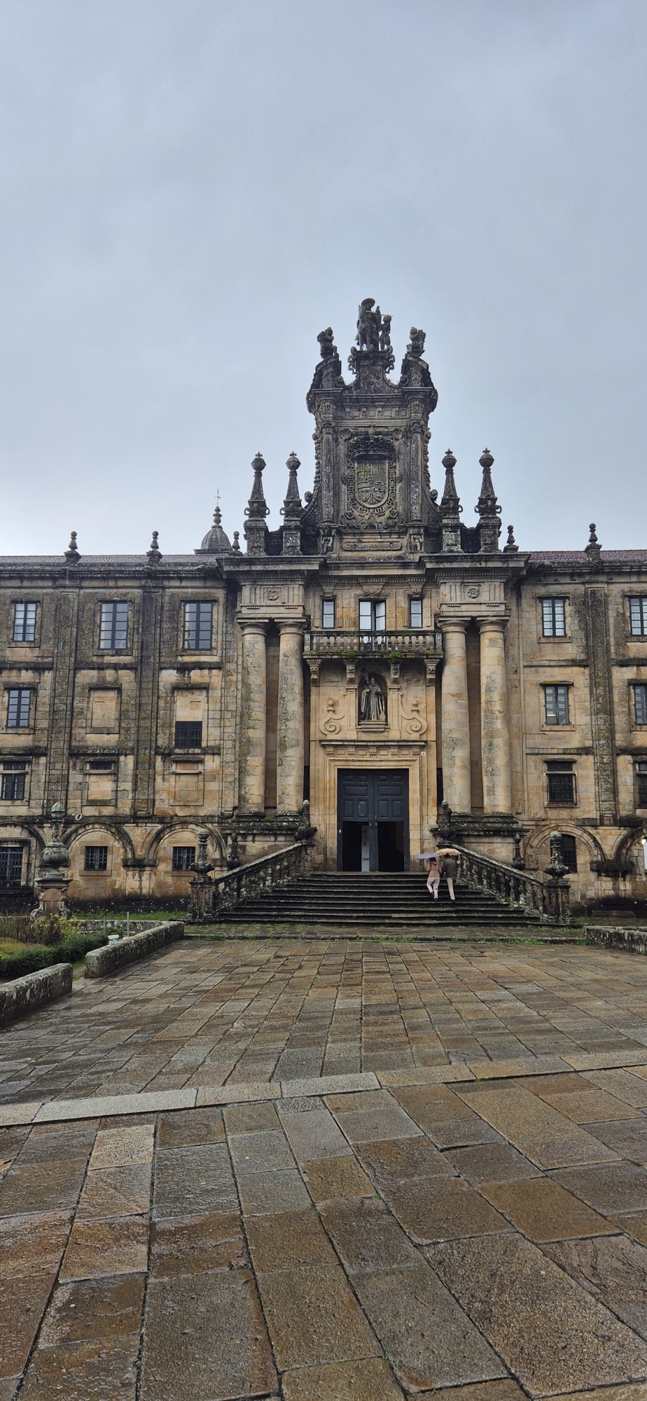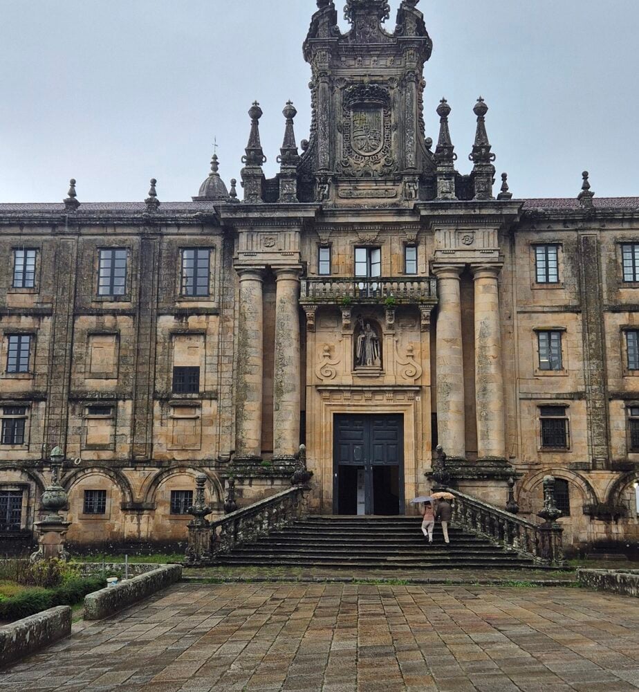 Emotional arrival at the Praza do Obradoiro — the traditional pilgrim finish.